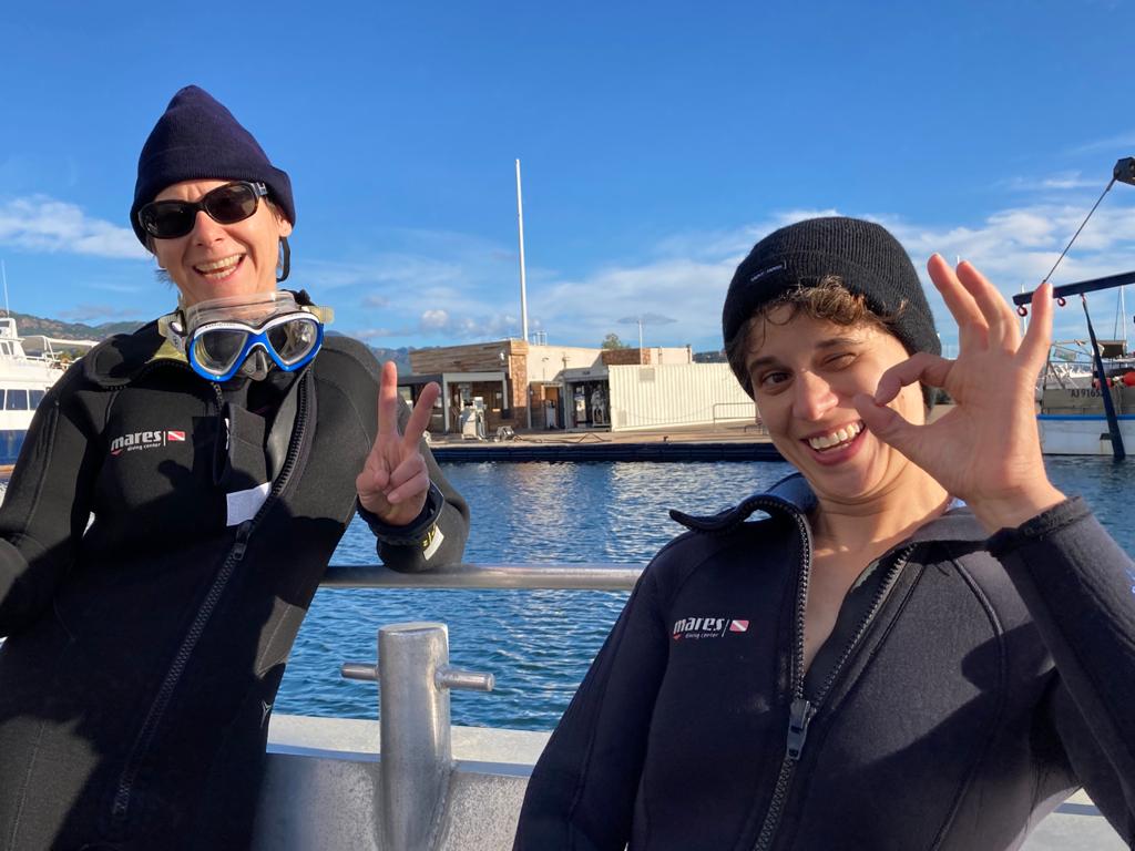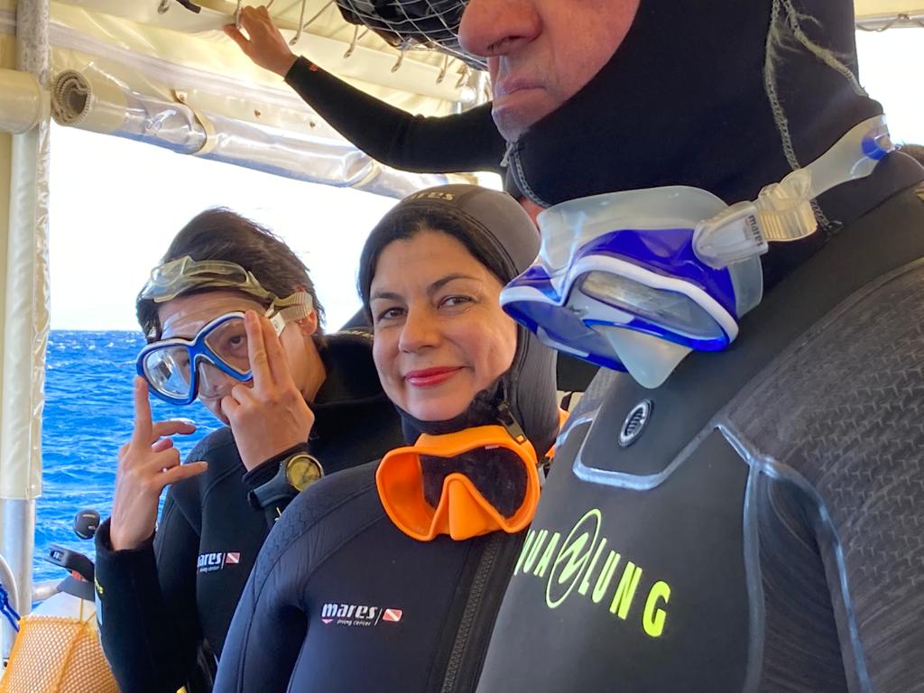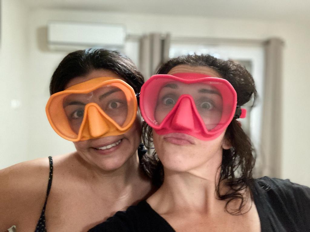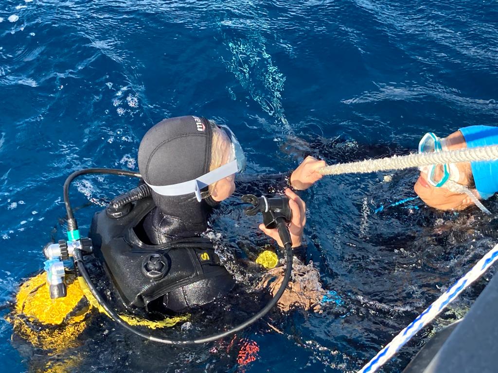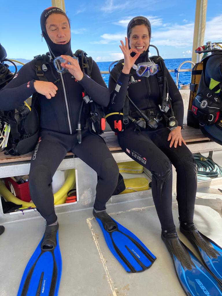 Et là le grand bleu, les fonds marins se dessinent sous mes palmes. Accompagnée de supers instructeurs (Mouss puis Noura) tout au long du séjour, j’apprends à surmonter mes angoisses (et à gérer cette foutue eau qui rentre dans mon masque !) pour profiter de la faune et la flore marines. Je me sens toute petite face à cette immensité d’eau, le silence est à la fois assourdissant et apaisant. Je remplis studieusement mon carnet de plongée avec les descriptifs des étoiles de mer, des girelles et autres poissons aux couleurs extraordinaires. Je ne me sens pas encore comme un dauphin dans l’eau mais plutôt comme un lamentin pataud ! Mais quelle fierté le dernier soir d’avoir pu acquérir mon niveau grand pédiluve marin, j’attends maintenant avec impatience le prochain voyage pour revivre ces émotions hors du commun, avec une équipe au top.