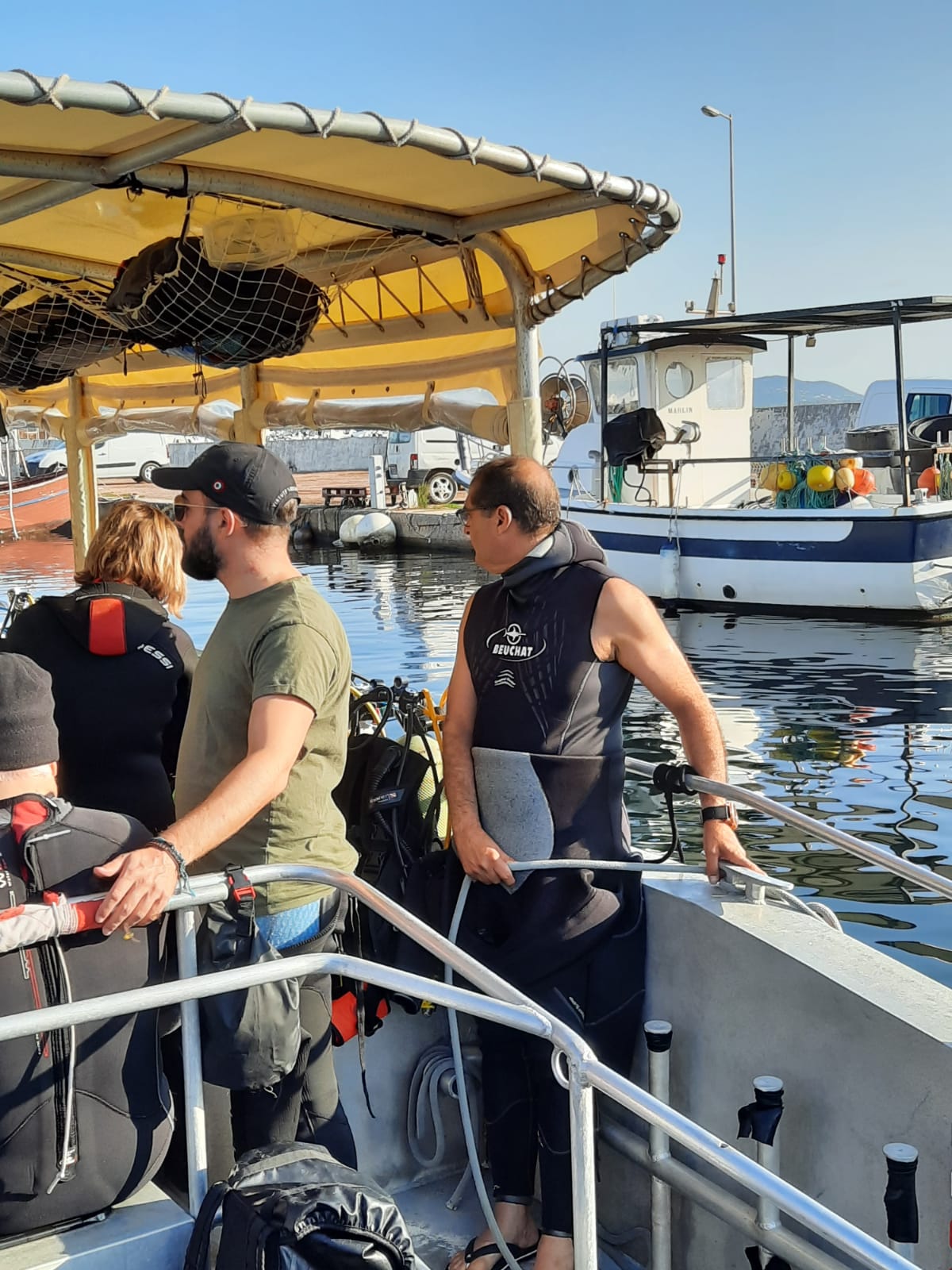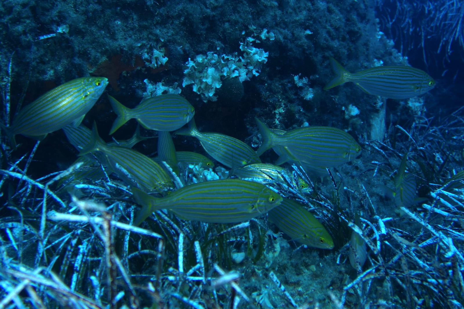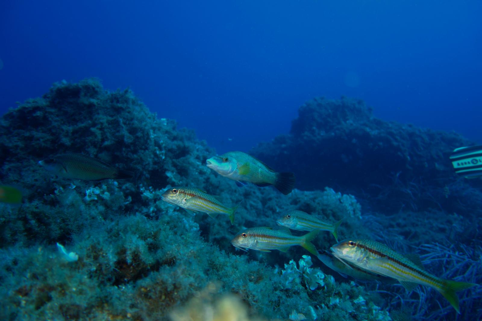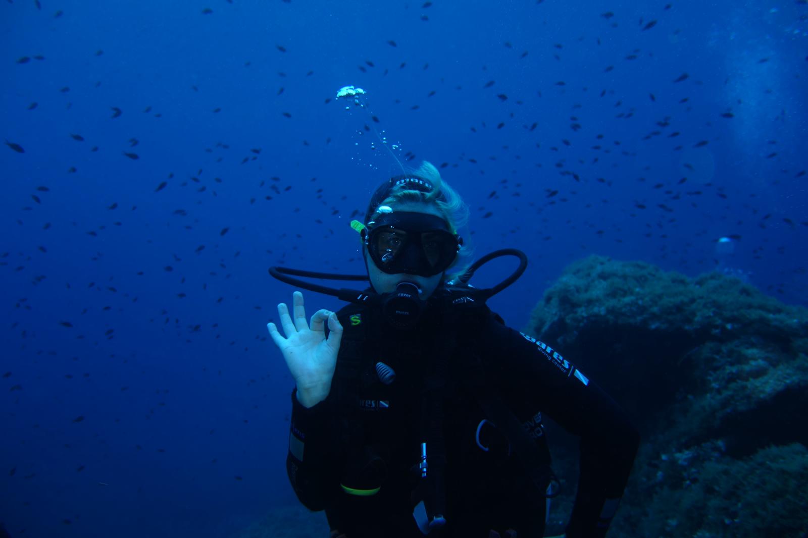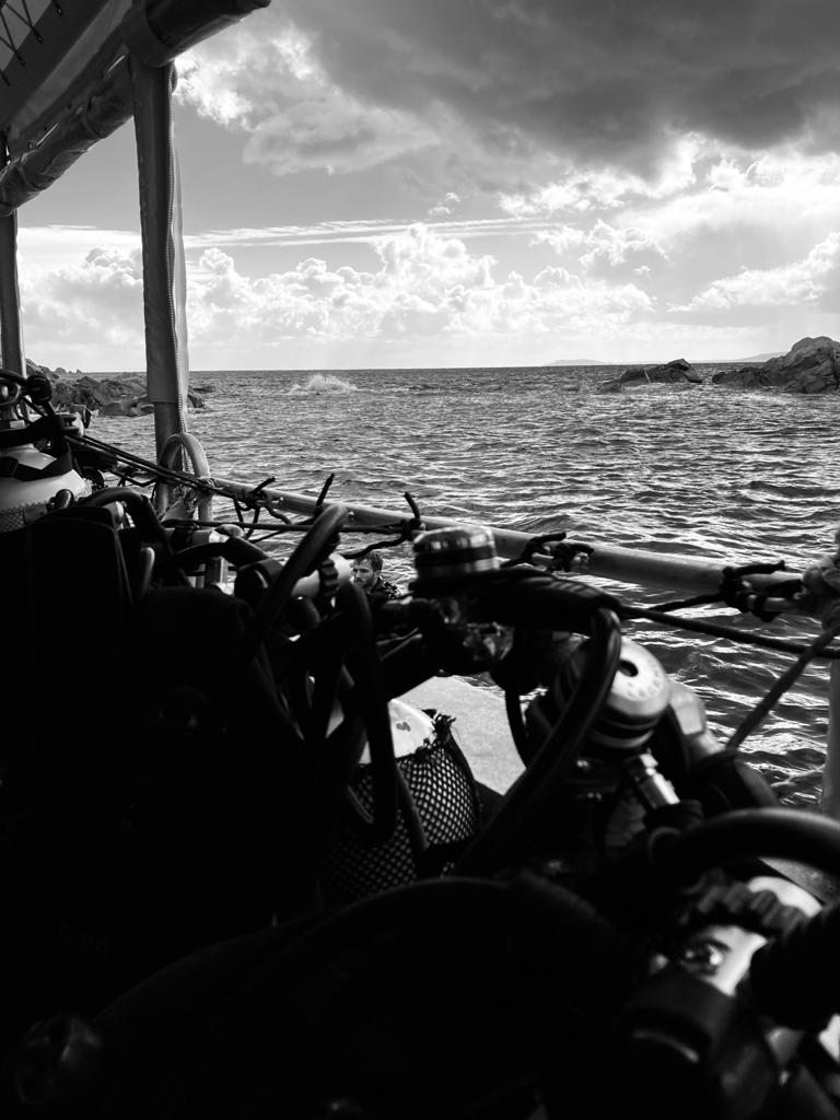 Abélia B. : Première escapade en mer. J’ai pu plonger pour la première fois en pleine mer. Après avoir surmonté l’enfilage de la combinaison mouillée, le poids du block, l’essayage du masque, et la virée en bateau sur mer quelque peu agitée, me voilà prête à sauter dans le grand bain ! Bon, je me souviens encore de Jean-Pierre m’expliquant, dans son bureau de Tenon, que la plongée est un sport de fainéant.. et que ça ne pourrait que me plaire. Je connais maintenant son obstination ( il avait su rebondir sur l’adoption du bébé chat, chose faite également), me voilà donc harnachée, prête à sauter, je n’ai plus le choix !
