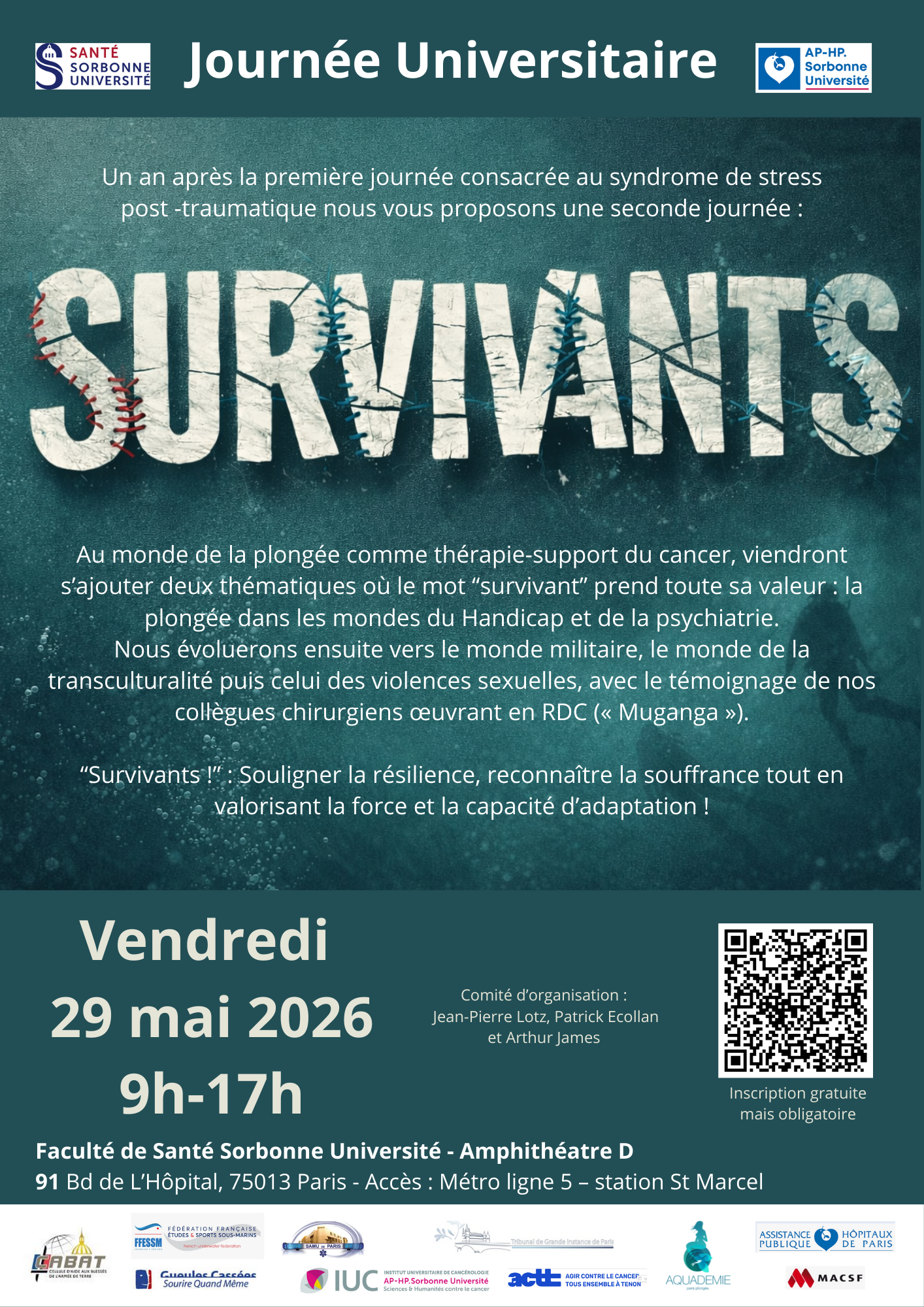 À la suite du succès de la première journée universitaire consacrée au syndrome de stress post-traumatique (SSPT), organisée en mai 2025 à Sorbonne Université et articulée autour de trois domaines majeurs – la cancérologie, le terrorisme et les conflits armés – Aquadémie Paris Plongée a souhaité poursuivre et approfondir cette réflexion collective.